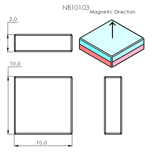 View full details10mm L x 10mm W x 3mm H block Grade N52 Ni-Cu-Ni triple coated Approx. 6.31 lb. / 2.86 kg pull force Magnetized through 3mm H Surface Gauss approx...