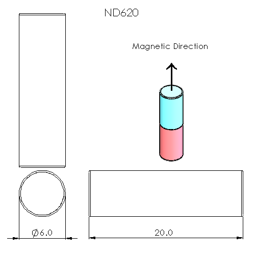 6mm OD x 20mm H cylinder Grade N52 Ni-Cu-Ni triple coated Approx pull force 4.52 lb / 2.05 kg Magnetized through 20mm H Surface Gauss approx. 7318 G